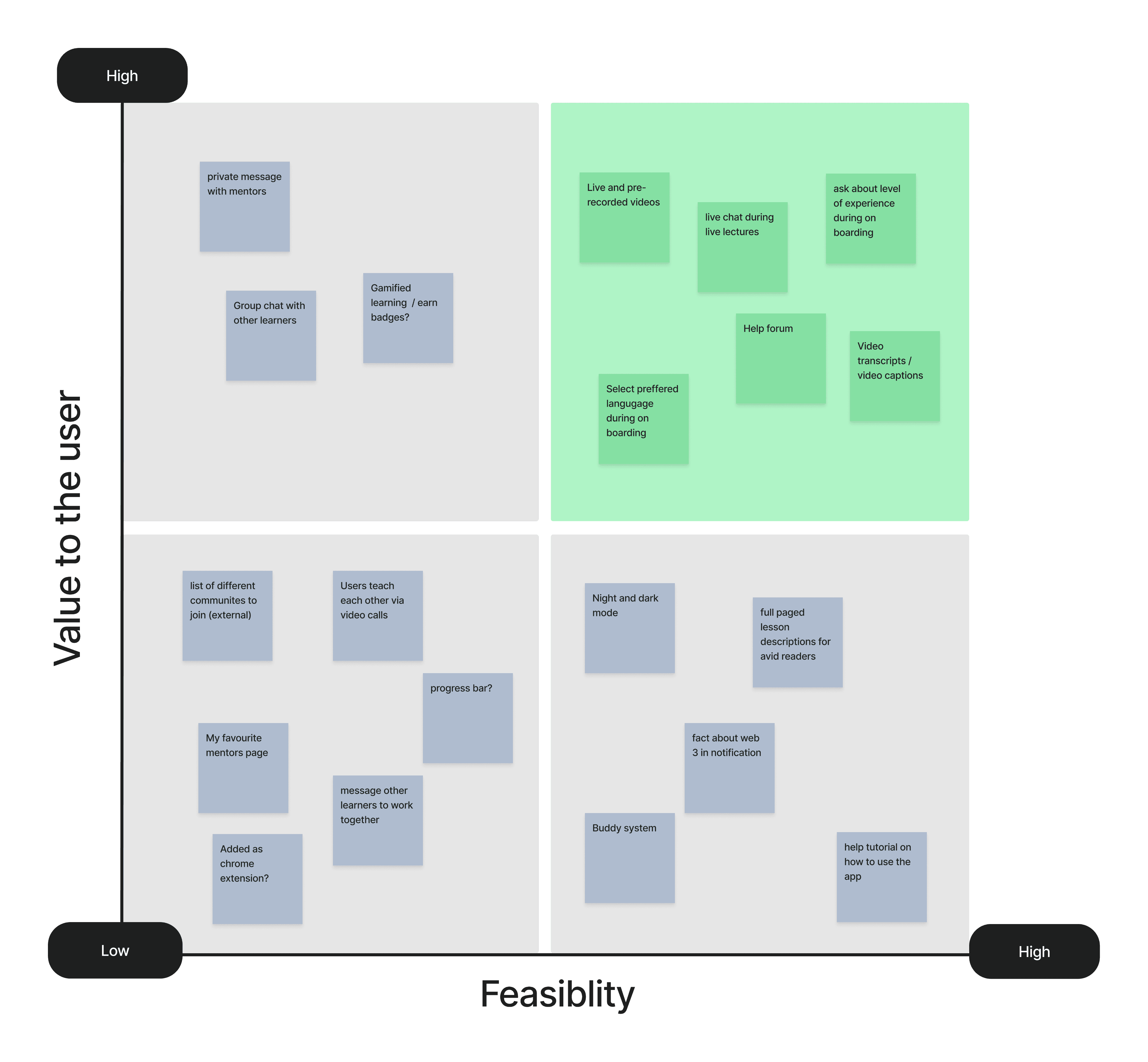 Due to our tight deadline, we needed to make a quick decision on which ideas to pursue. To make the best decision, we created a prioritization matrix. Which helped us sort our ideas based on how feasible they were and how much value we think they would bring to the user.