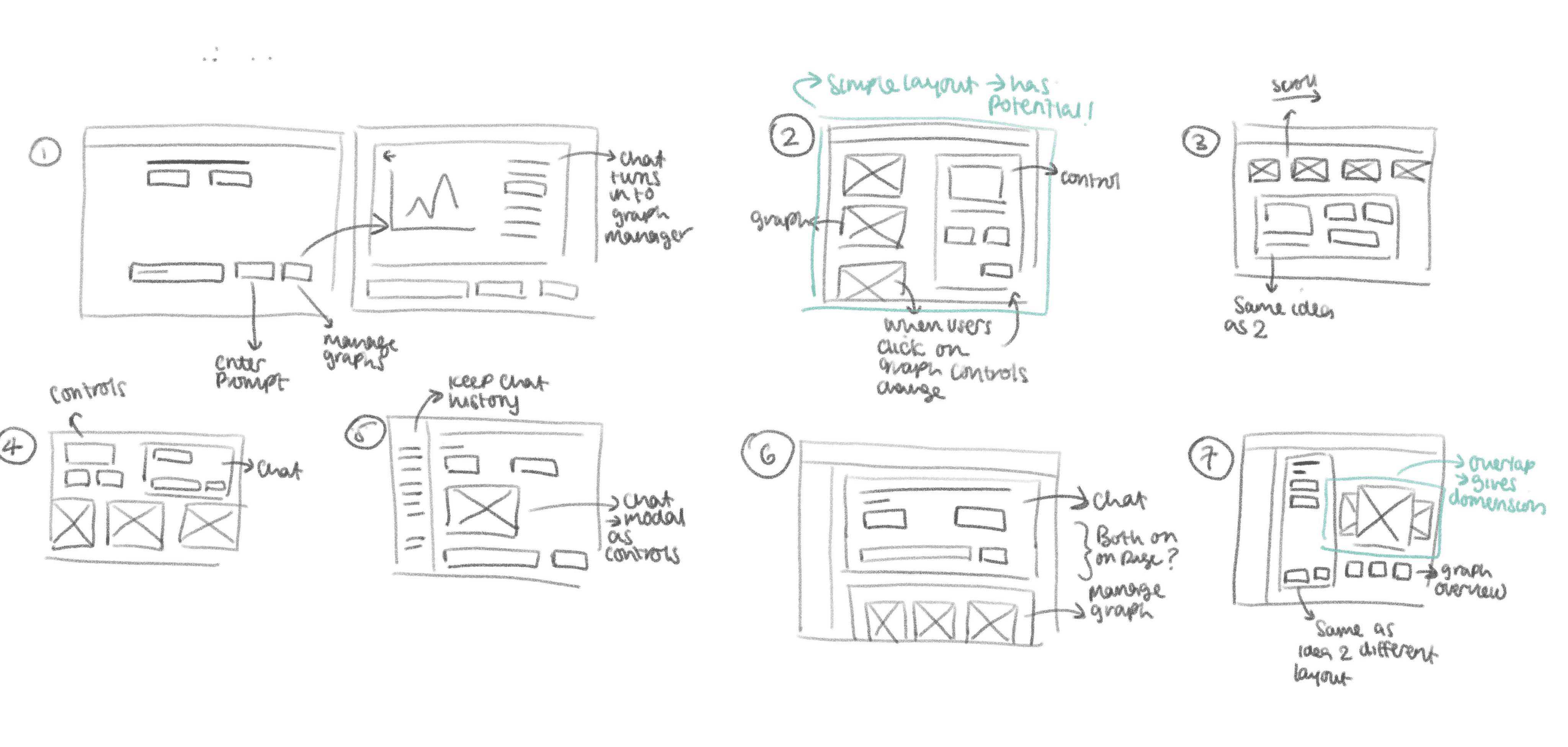 I sketched out as many solutions as possible. In end we settled with this design as it was the most straight forward solution. The idea was to have 2 screens, a place where users can create graphs (using the chat bot) and a place for them to manage existing ones